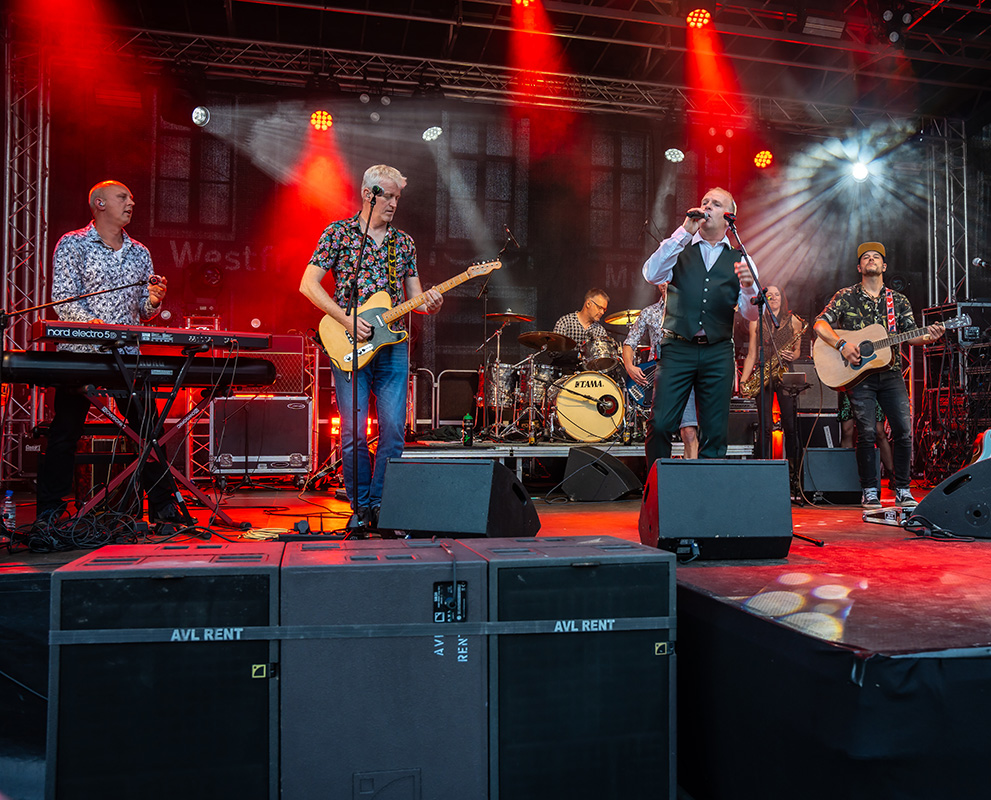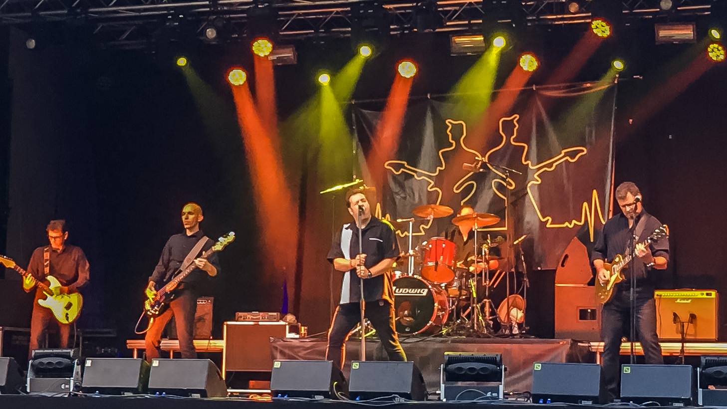Met een blazerssectie, vette hammond, stuwende gitaren en een zanger die akelig dicht bij Huub komt, brengen ze de energie en bezieling van een echte De Dijk live-show.